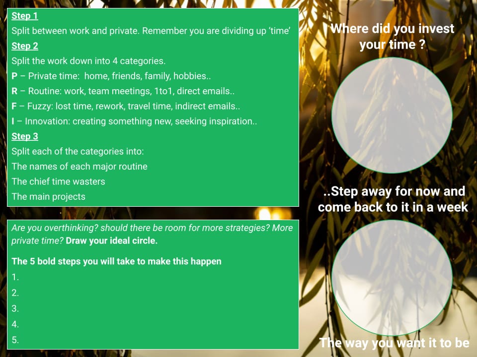 How do you allocate your time to go to the essentials ? Here is a simple exercise to think about it: draw a circle which represents 24h of your day and follow the instructions.